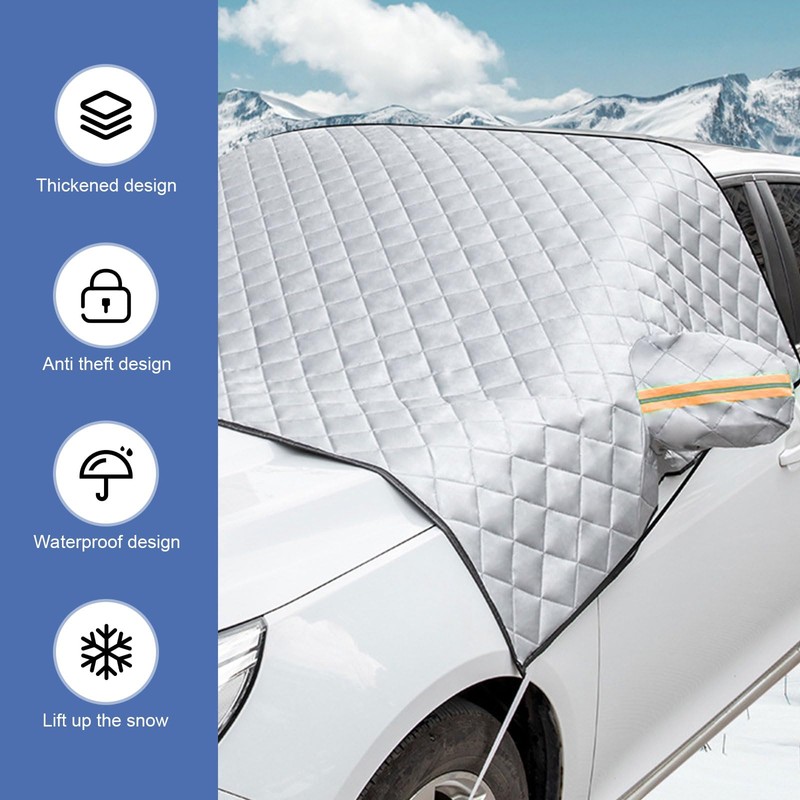 Windshield cover is made of thickened high quality material.Elastic fastening straps fit tightly to the car and are not easily blown away by the wind.Silver luster reflects heat and is hard and strong.It is also windproof and breathable.
