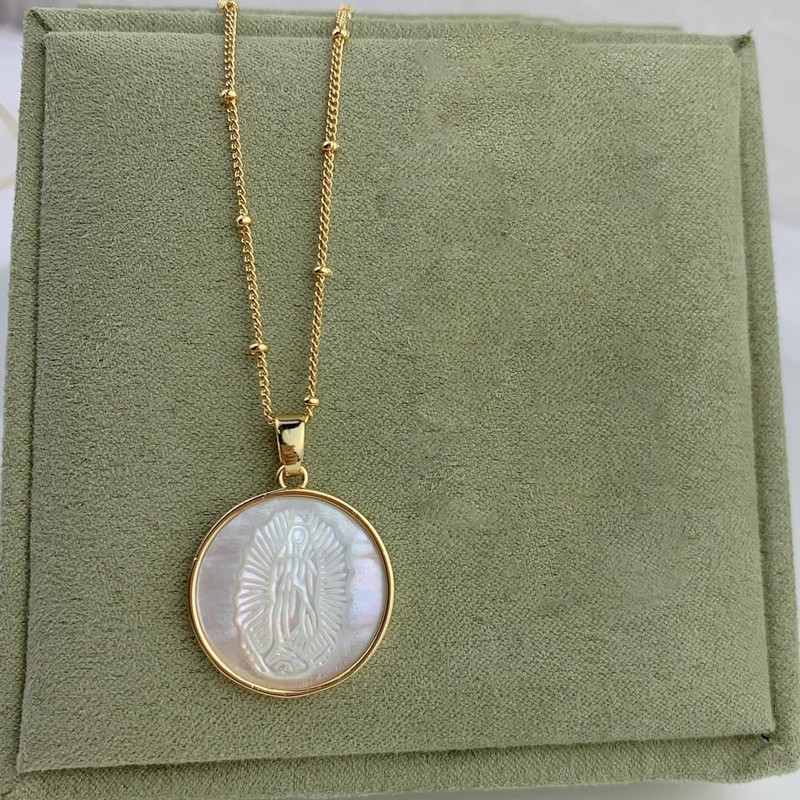- Material: The necklace with the miraculous medal of the Virgin Mary of Guadalupe is set with a round white pearl shell in which the Holy Virgin Mary is engraved. It is lead and nickel-free and not skin sensitive.