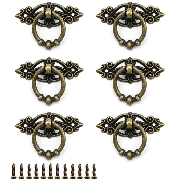 Dylan-EU 6 Pcs Antique Ring Pull Handle with Screws Cabinets Kitchen Wardrobe Drawer Cupboard Vintage Furniture Hardware Vintage Pull Ring Retro Knob - Antique Brass
