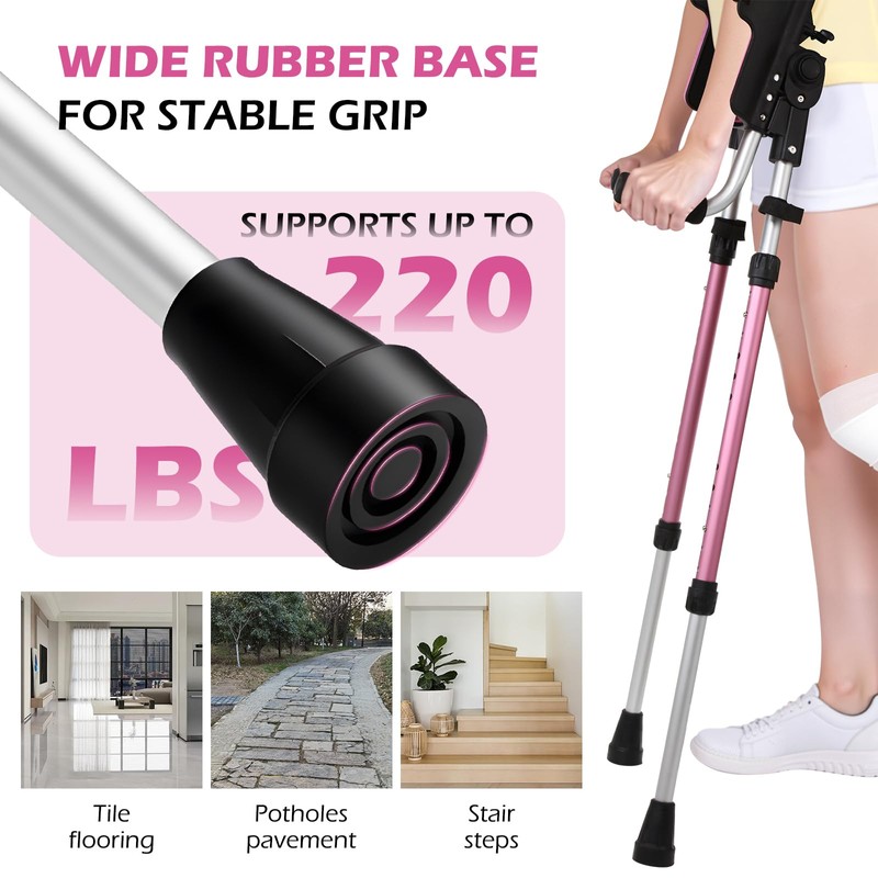 - 【Durable and Lightweight Construction】: Crafted from aluminum alloy with thickened middle pipe of 1.4mm thickness. Crutches can support up to 220 pounds, offering a sturdy and reliable support without compromising on weight.