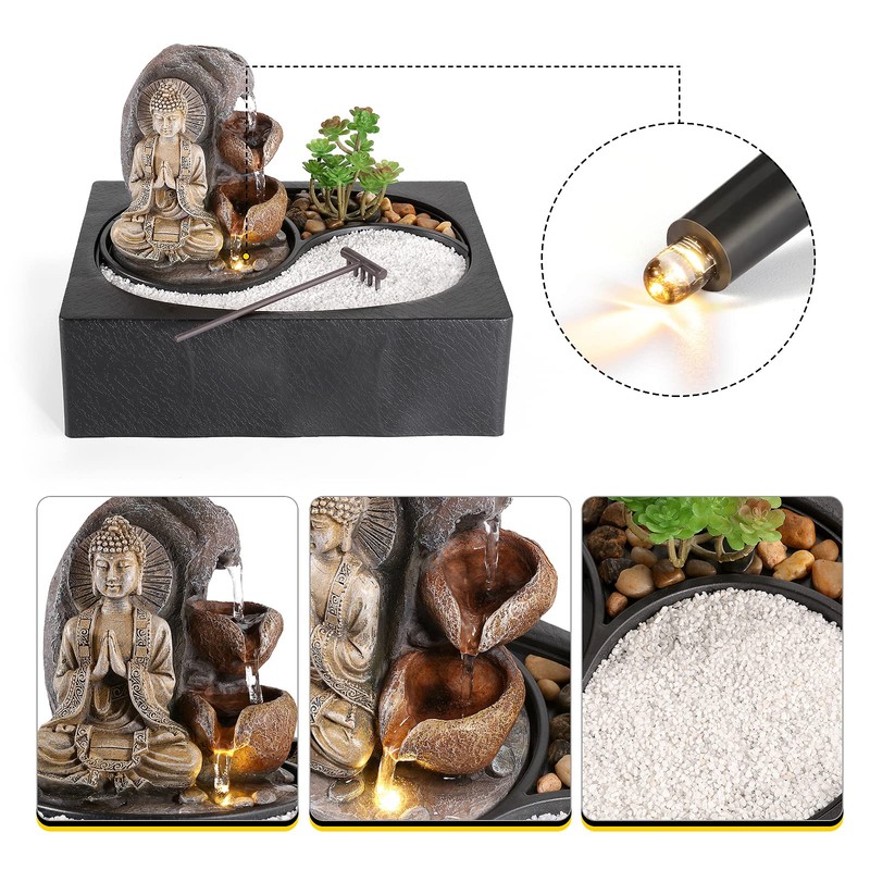 - Indoor Water Fountain with Zen Garden- Our tabletop fountain accessorizes with warm lights, which can add some beauty to your room. Come with a zen garden kit that includes 1*fake plant,1*bag of stones, 1*bag of sand and 1* sand rake. (Size: 11.41*8.26*8.85 in)