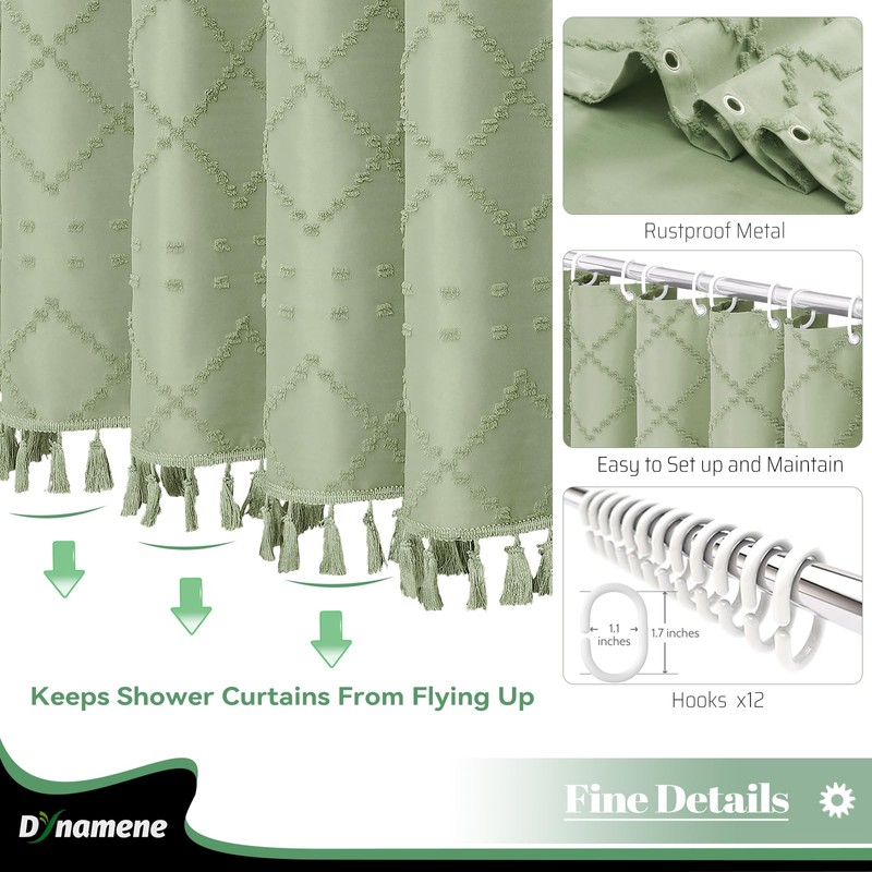 Dynamene Dynamene 80 Inches Long Shower Curtain, Boho Tufted Geometric Striped Tall Cloth Shower Curtains for Bathroom Decor, Large Hotel Luxury Shower Curtain Set, 12 Hooks, Wrinkle Free, Sage Green, 72x80