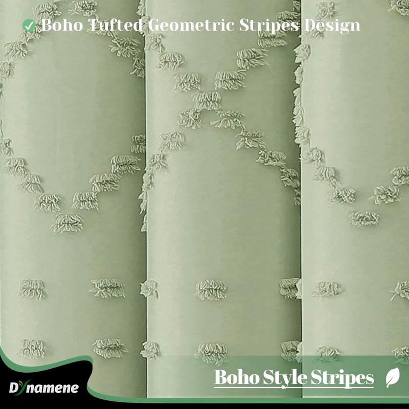 - Sage Green Boho Shower Curtain with Tufted Geometric Stripes This bright sage green Fabric shower curtain for bathroom features tufted geometric stripes, making this striped shower curtain suitable for diverse decoration styles, like modern farmhouse, contemporary, simple, bohemian, shabby chic styles. These unique geometric stripes are exactly as shown, which can add a boho touch to your master bathroom, guest bathroom or hotel spa. Choose it, you won't be more pleased!