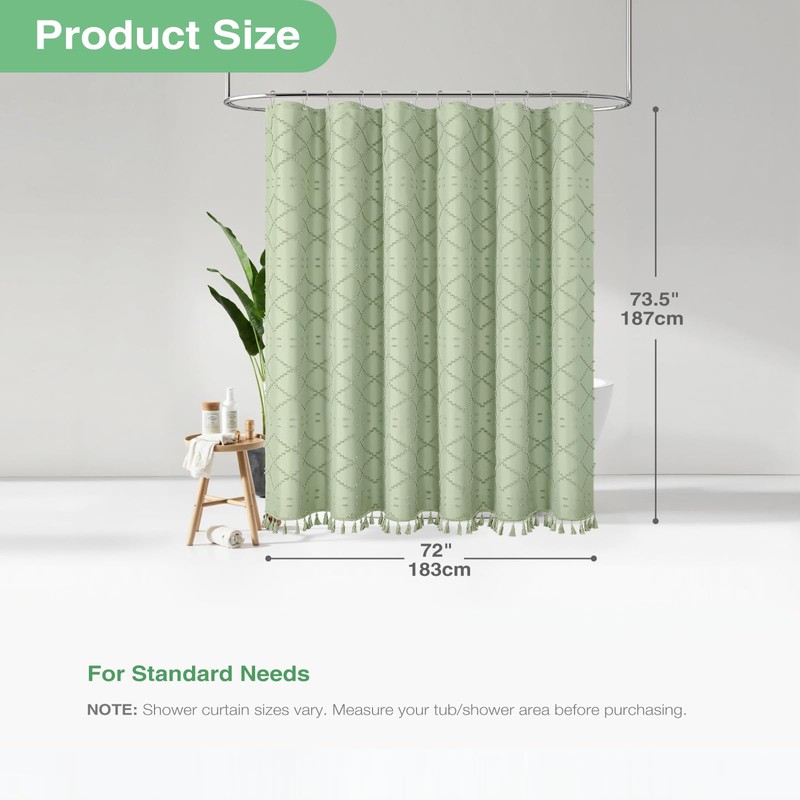 - 🚿【 Sage green Boho Shower Curtain with Tufted Geometric Stripes 】 This bright sage green Fabric shower curtain for bathroom features tufted geometric stripes, making this striped shower curtain suitable for diverse decoration styles, like modern farmhouse, contemporary, simple, bohemian, shabby chic styles. These unique geometric stripes are exactly as shown, which can add a boho touch to your master bathroom, guest bathroom or hotel spa. Choose it, you won't be more pleased!