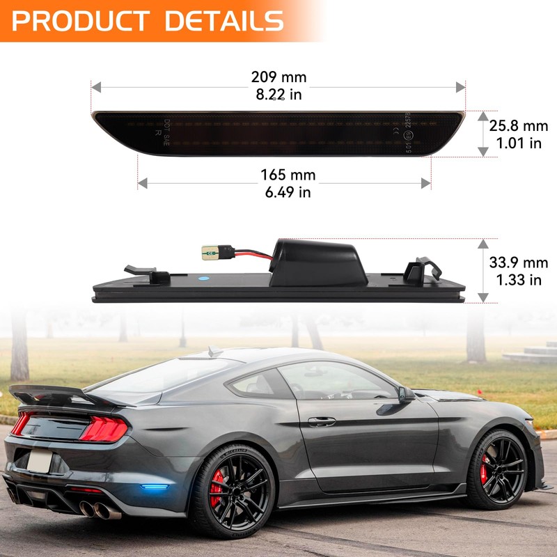 - πππππ πππππππ Both of LED rear bumper side marker lights for Ford Mustang 2015-2023 have CE/SAE/DOT Certified. Made up of durable PC lens and ABS housing, IP67 waterproof, lifespan more than 55000 hours.