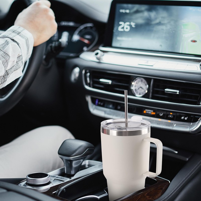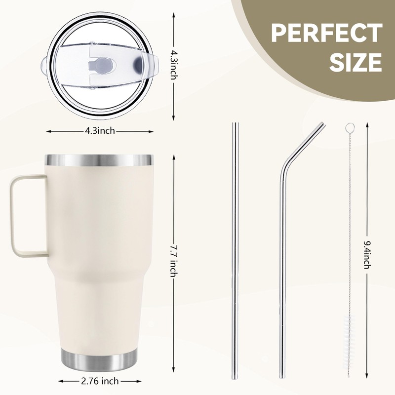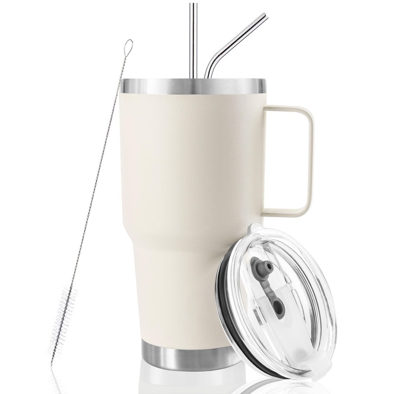 DYNAMIC SE 30 oz Cream Tumbler With Handle, Double Wall Stainless Steel Vacuum Insulated Travel Mug with Splash-Proof Lid Metal Straw and Brush