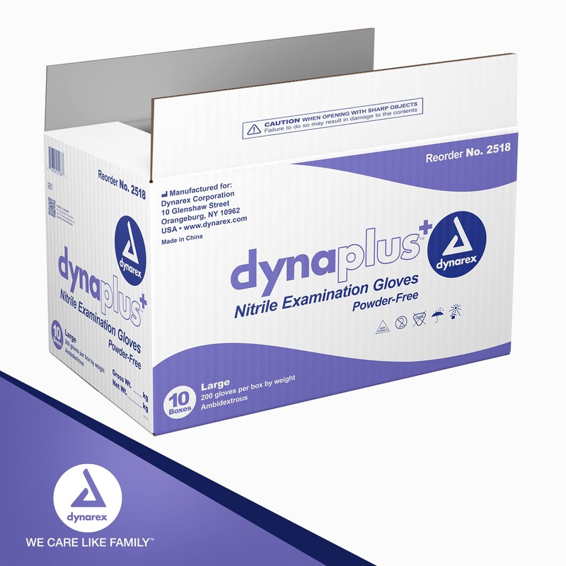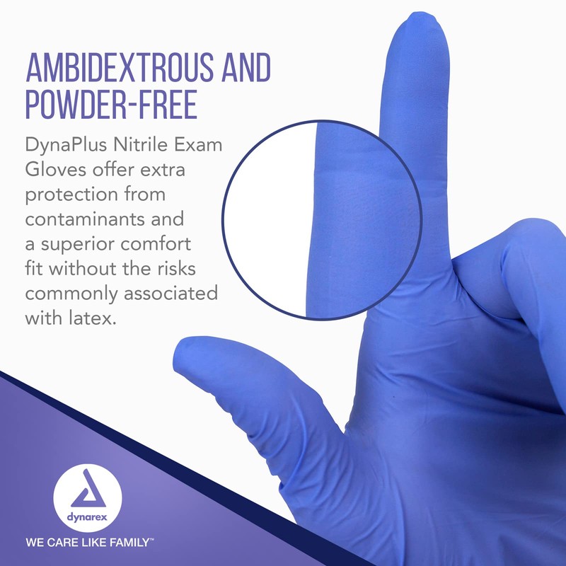 - STRENGTH PLUS VALUE: The Dynarex DynaPlus Disposable Nitrile Exam Gloves are packaged in boxes of 200 gloves. These gloves are strong with textured fingertips for better gripping as well as a narrow wrist cuff to keep hands safe, dry, and sanitary.