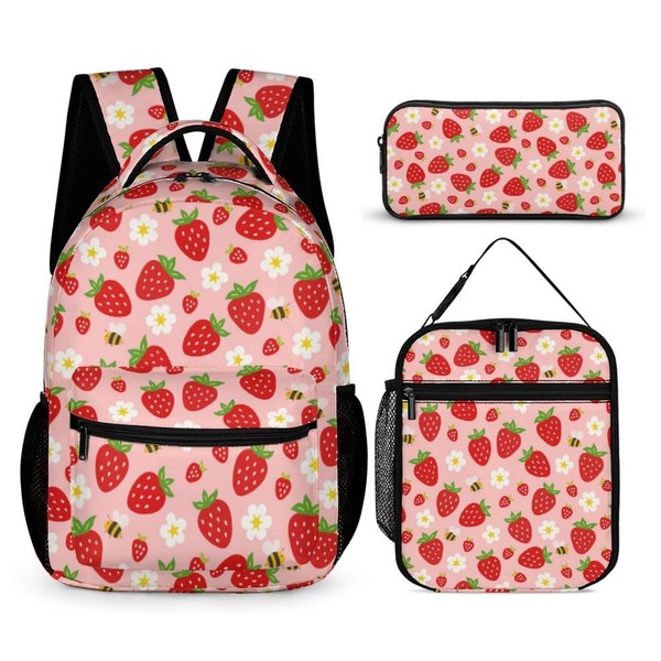 DYOTHiK 3PCS 17" Strawberry Backpack, Shoulders Backpack with Insulated Lunch Bag Durable Strawberry Laptop Bag Daypack with Multiple Pockets (Strawberry)