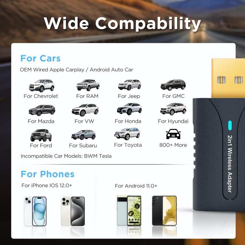 - 2-in-1 Carplay and Android Auto Wireless Adapter: Easily transform wired Android Auto / Carplay into a wireless experience. No additional drivers or apps required. Connect your Bluetooth and WiFi and the wireless adapter will automatically connect to your phone when you start your car, even if your phone is in your pocket or on a call