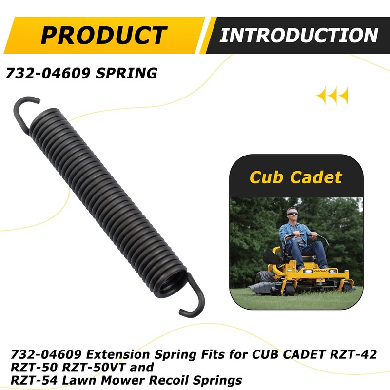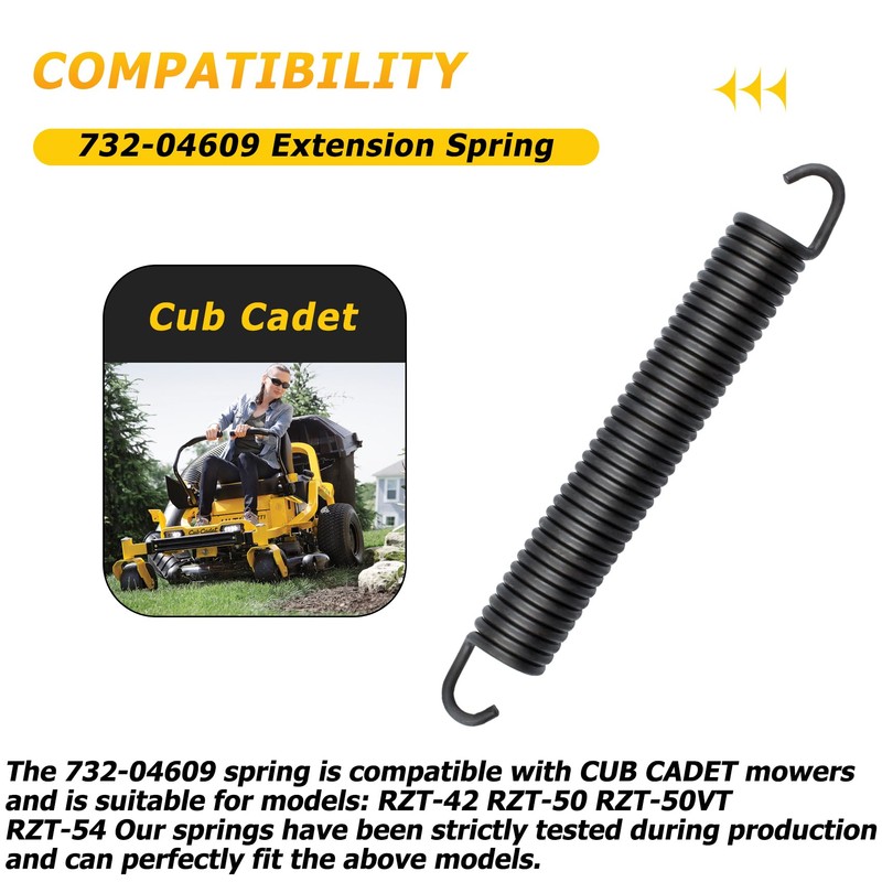 - Compatibility: The 732-04609 spring is compatible with CUB CADET mowers and is suitable for models: RZT-42, RZT-50, RZT-50VT, RZT-54. Our springs have been strictly tested during production and can perfectly fit the above models.