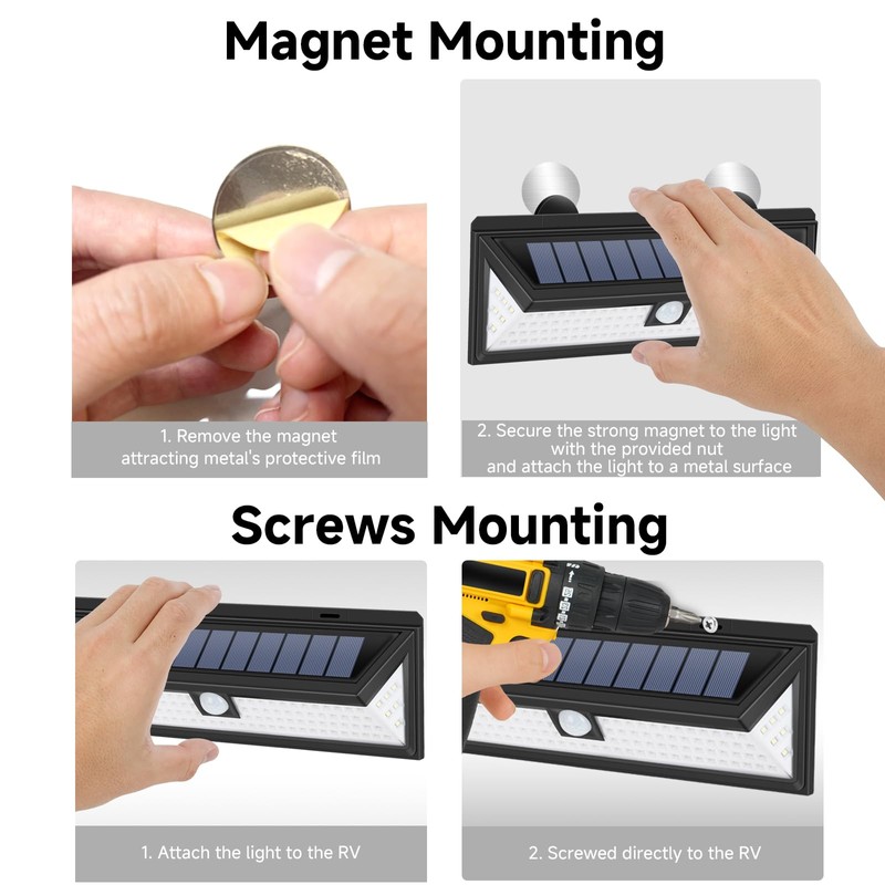 - No-Drill Magnetic Mounting for Any RV Surface: This Magnetic Solar RV Light comes with two ultra-strong magnets that snap securely onto any metal RV surface—no drilling, no tools, no stress. Got a fiberglass trailer or camper? Just stick the included metal plates to your surface, then magnetically mount the light—easy on, easy off. Prefer a more permanent setup? We’ve got that too—screws included for a rock-solid installation. This light is built for all RV exterior lighting needs, no matter your rig