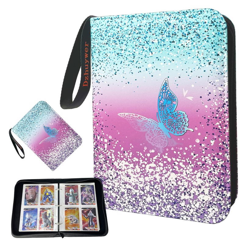 Dzhuywer Trading Card Binder for 4-Pocket 480 Cards with 60 Removable Sleeves with Protection Zipper Easy Carrying Wristband, Portable Trading Card Albums for Boys Girls Gifts, Pink Blue Butterfly