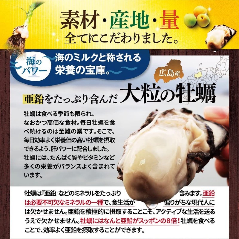 - ✅[3大素材の1つ! 亜鉛 たっぷり!広島県産大粒の 牡蠣 使用] 海のミルクと呼ばれる 牡蠣 には、 亜鉛 などの ミネラル がたっぷり含まれています。 亜鉛 は必要不可欠な ミネラル の1つで、アクティブな生活を送るうえで欠かせない成分です。 牡蠣 にはスッポンの8倍の 亜鉛 が含まれており、その 牡蠣 を使って抽出した 亜鉛 を 肝パワーE+ にギュッと凝縮しました。