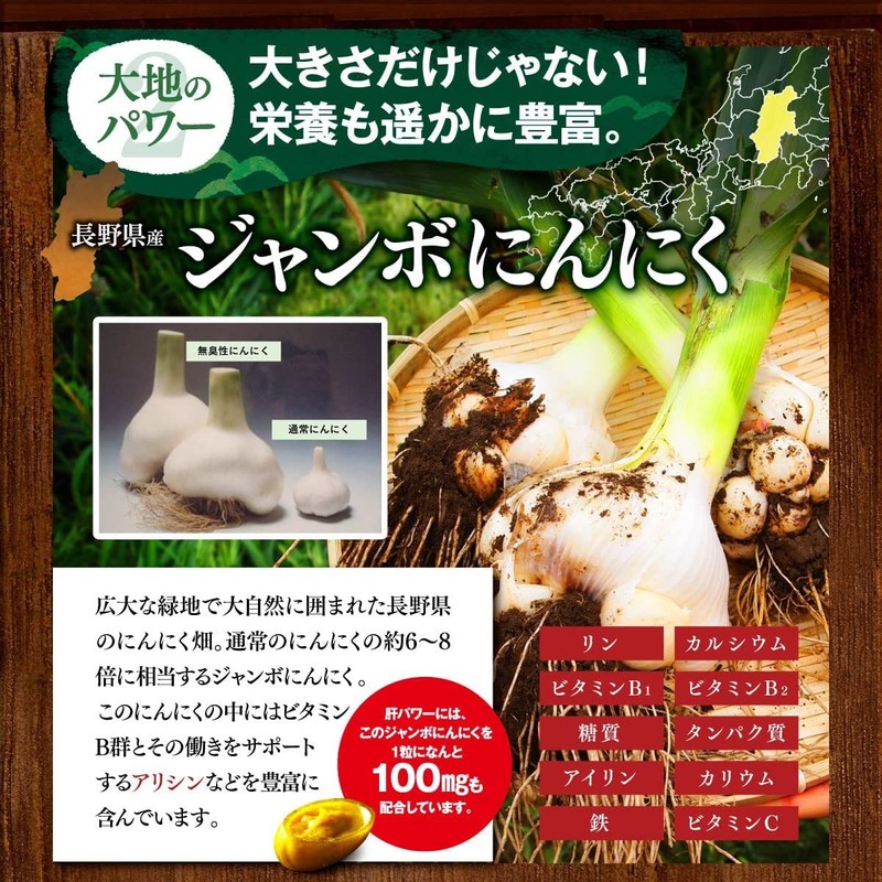 - ✅[ジャンボ にんにく や 南高梅 を使用] 肝パワーE+ は、大きいだけじゃなく栄養価が高い長野県産のジャンボ にんにく ※を使用。ジャンボ にんにく の中には、ビタミンB群とその働きをサポートする アリシン を豊富に含んでいます。また、 クエン酸 をたっぷり含んだ和歌山県紀州産の 南高梅 を使用しました。伝統的健康食品である 梅 には クエン酸 が多く含まれています。 クエン酸 は乳酸がたまりがちな身体のエネルキー源となる栄養素で、あなたの身体をサポート! ※通常の にんにく の約6~8倍