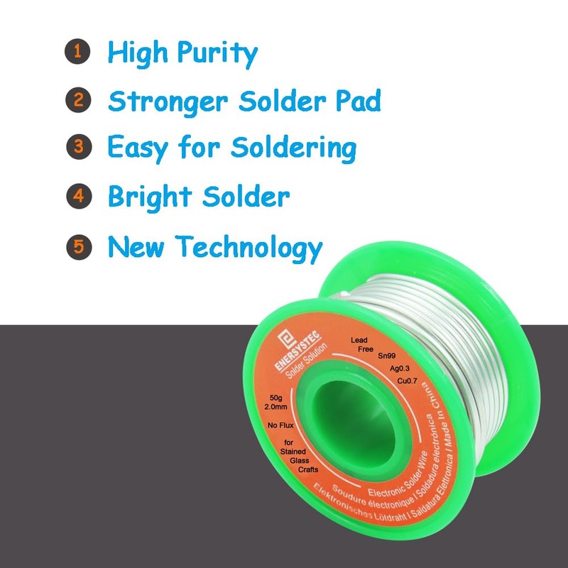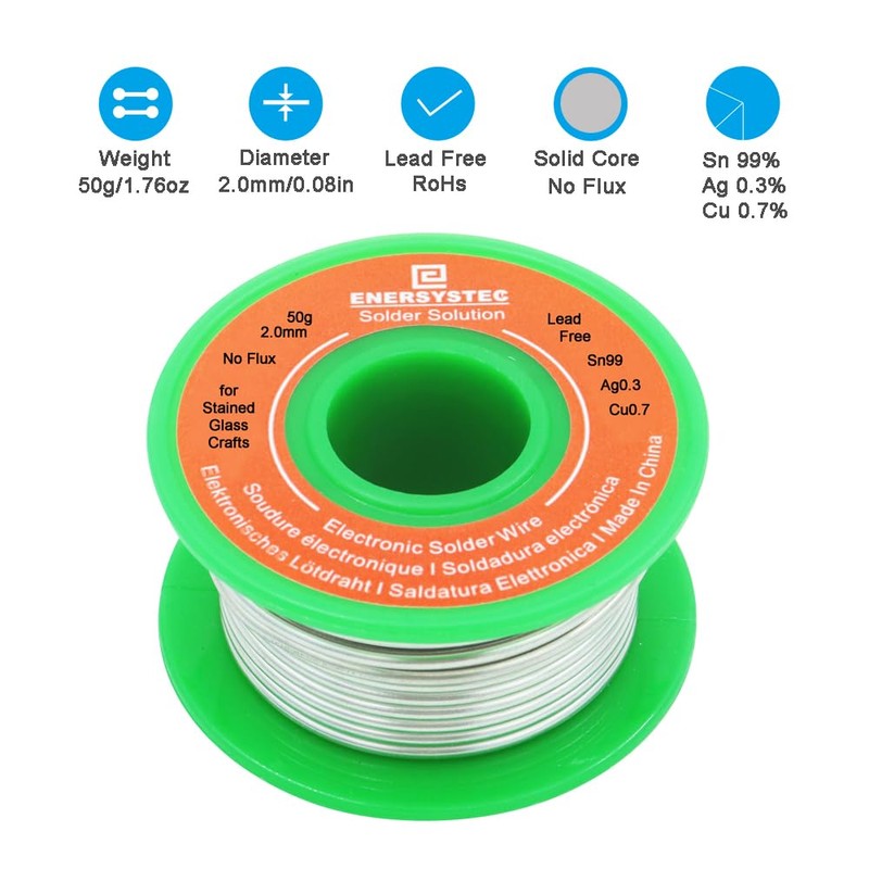 E ENERSYSTEC 2.0mm Lead Free Solder Wire for Stained Glass Craft, Dia 0.08 Solid Core No Flux 50g, Craft Soldering Wire, Sn99 Ag0.3 Cu0.7, Thick Solder Wire Without Flux for Crafts Project DIY