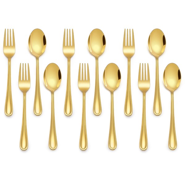 E-far 12-Piece Toddler Silverware, Stainless Steel Kids Utensils Forks and Spoons, Children Safe Mirror Polished Metal Cutlery Set for Self Feeding, 6 Forks & 6 Spoons(Gold)
