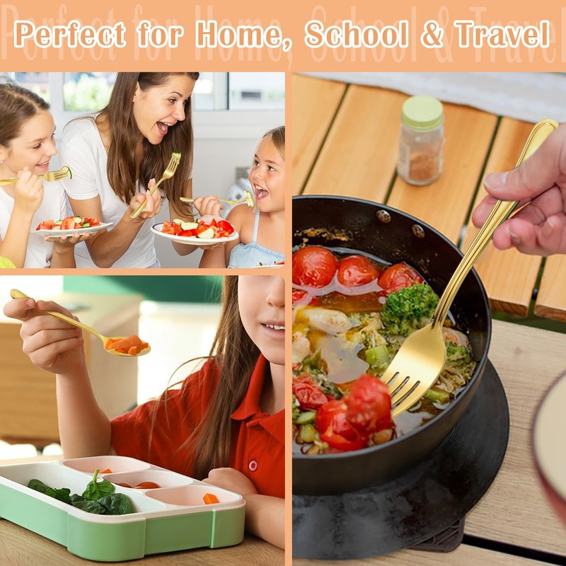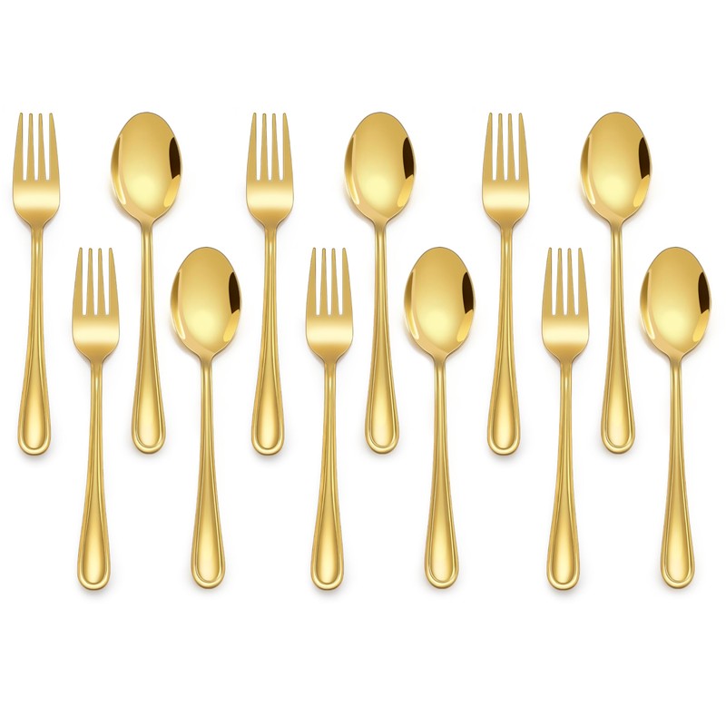 SPECIFICATION Material: Stainless Steel Number of Pieces: 12 Color: Gold Features: Easy Clean, Durable, Mirror Polished & Dishwasher Safe, Rustproof & Non-Toxic