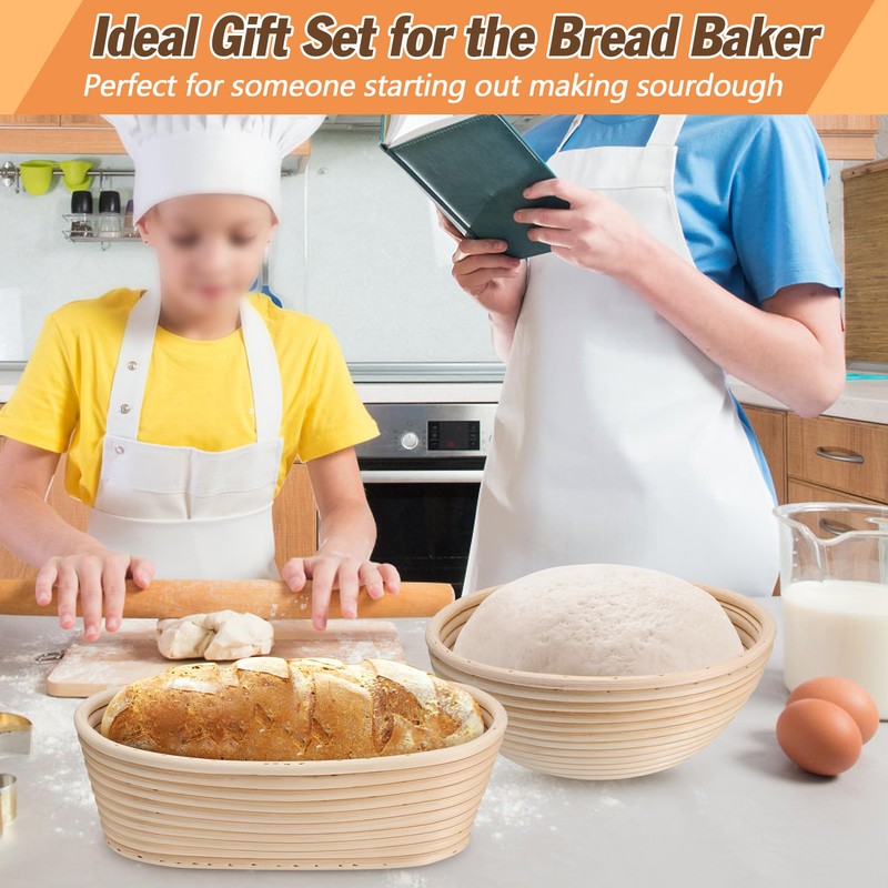 - IDEAL GIFTS FOR BREAD LOVERS: Includes 9” round and 10’’ oval baskets with linen liners, scoring lame with protector and 5 blades, dough whisk, plastic scraper, dough cutter, silicone brush and silicone bread sling, This starter kit is suitable for home use or bakery, Also a great gift for family and friends at Christmas