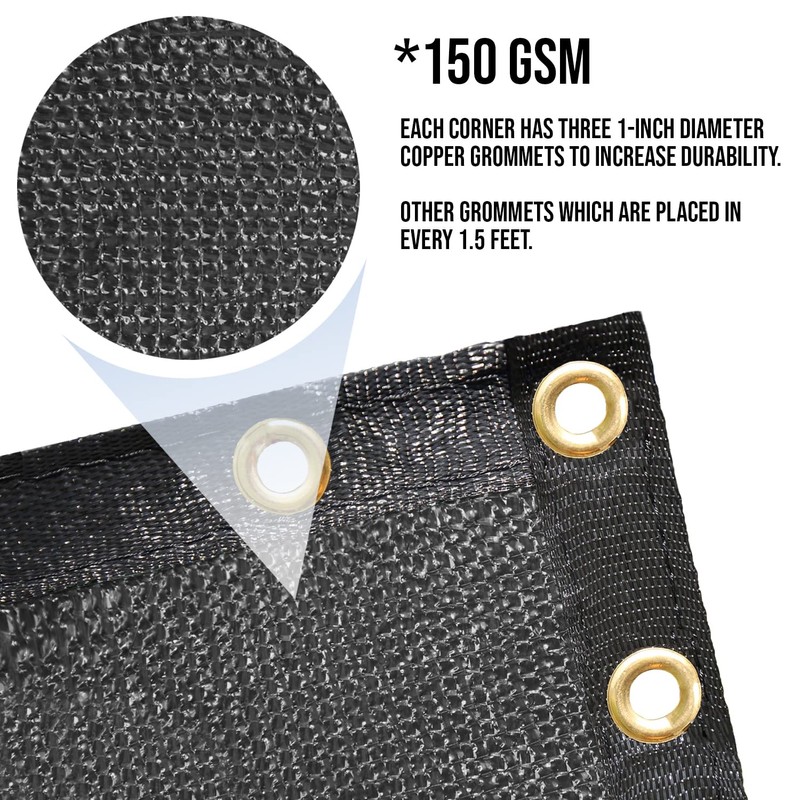 - REINFORCED EDGE WITH GROMMETS - The grommet is made of strong copper and placed evenly on all 4 sides. 3 grommets are placed on every corner for extra strength. The edge is finished with 1.5" black binding and will provide better durability when it is attached to the fence.