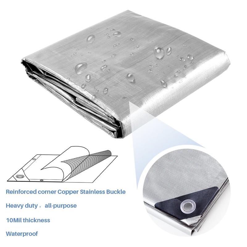 * Mil is the thickness of the material, one mil=0.0254mm. * Reinforced, Reversible. * All edges are heat-sealed and reinforced with polyethylene rope. Our tarps are made from a tight polyethylene weave which provides super durability. * All full sizes, no "cut sizes". * Tarps can be used as protection for boats, cars or motor vehicles. Camping tarpaulin provides shelter for these elements, ie., wind, rain or sunlight for campers, such as an emergency roof patch material for homeowners; as a temporary pickup truck bed cover, and for a ground or drop sheet. * Warning: Flammable. This product will ignite and burn if brought into contact with an open flame.