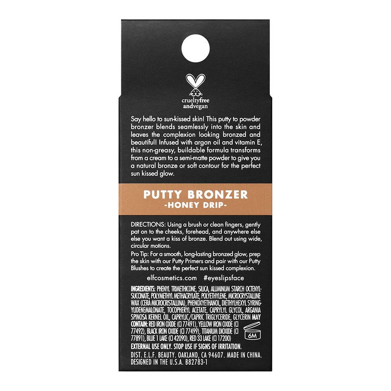 - CREAM-TO-POWDER FINISH: Bask in that sun-kissed, back-from-vacation glow all year round with e.l.f. Putty Bronzer. This unique creamy putty-to-powder bronzer delivers highly pigmented, buildable color, and effortlessly blends and blurs into skin, delivering a natural bronzing effect with a smooth, semi-matte finish.