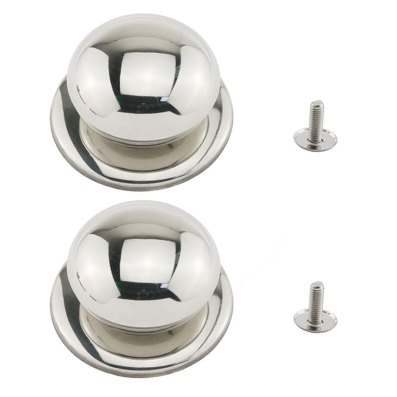 - Material: stainless steel. Color: stainless steel chrome. Suitable for: 6mm mounting hole of the lid. Top diameter: 4cm (1.6 inches). Proportional diameter: 5.4cm (2.1 inches). Package includes: 2pcs pot lid knobs.