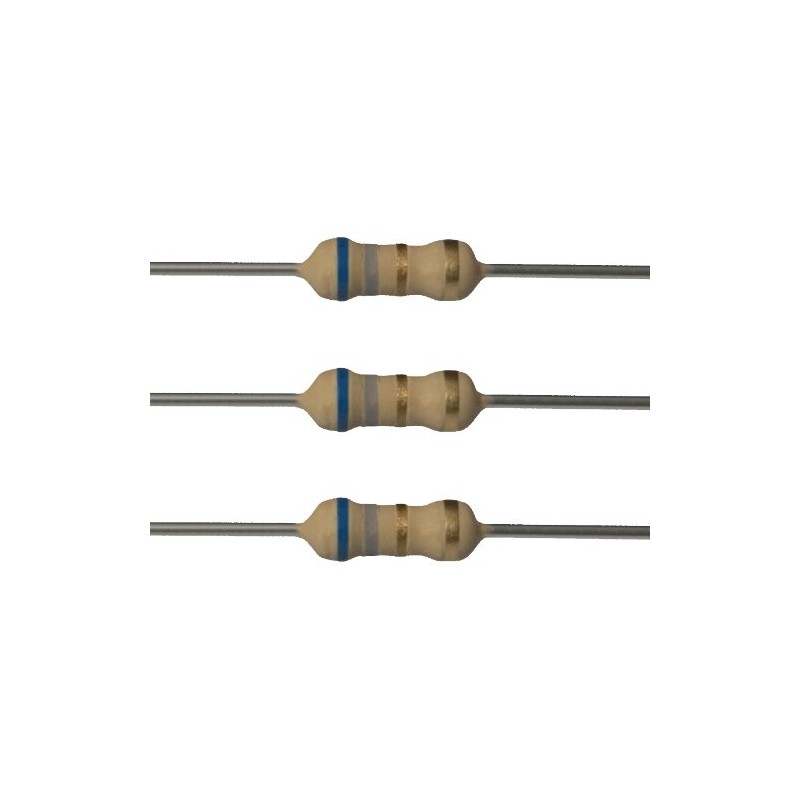 100 each 6.8 ohm resistors. 1/4 watt. 5% tolerance. Flame retardant coating. Lead free & RoHS Compliant. Cut tape packaging.