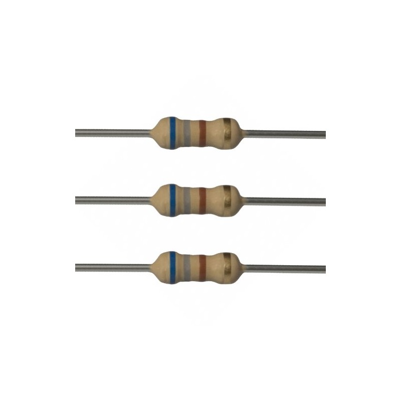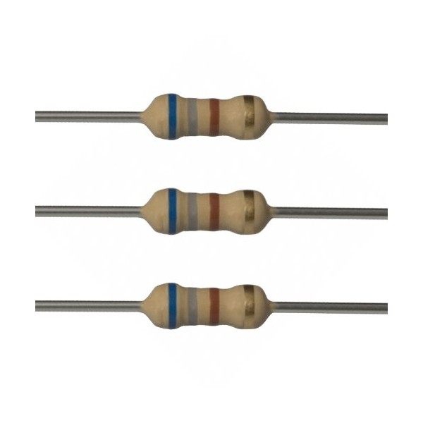 25 each 680 ohm resistors. 1/4 watt. 5% tolerance. Flame retardant coating. Lead free & RoHS Compliant. Cut tape packaging.