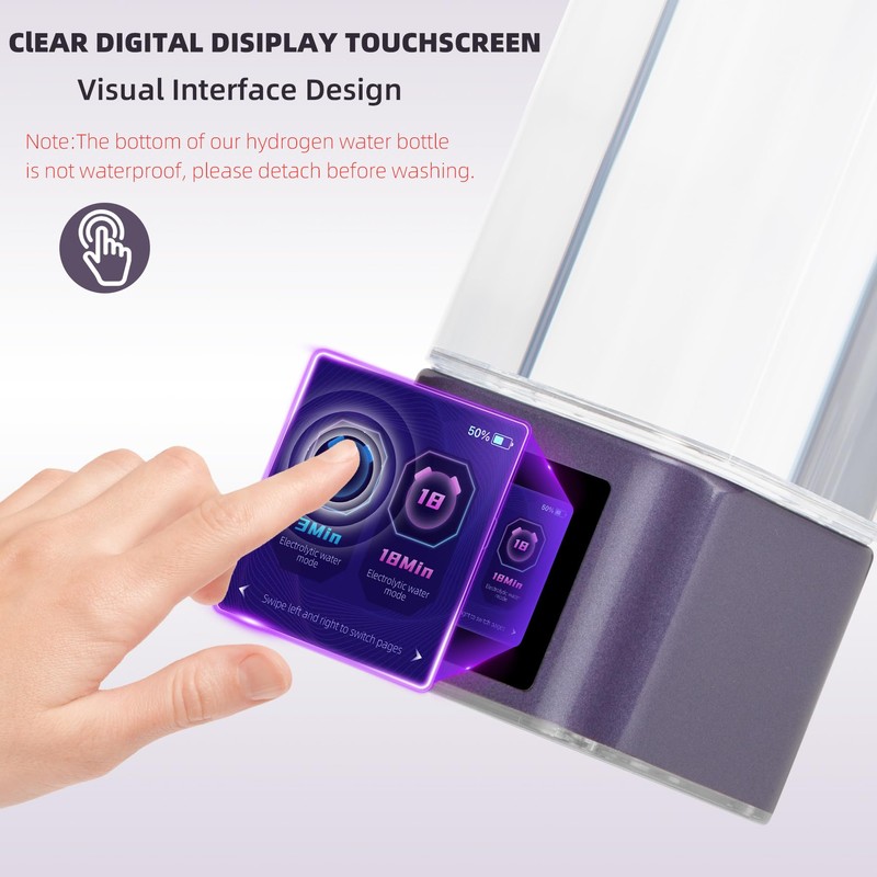 - Smart Touch Control for real-time health monitoring: Stay informed with an intelligent touch screen that displays live readings: hydrogen content, battery life, time and negative potential (antioxidant strength). Simplify your routine with intuitive controls that track your drinking habits and provide a premium, technically oriented experience. Perfect for health-conscious users who want transparency and precision.