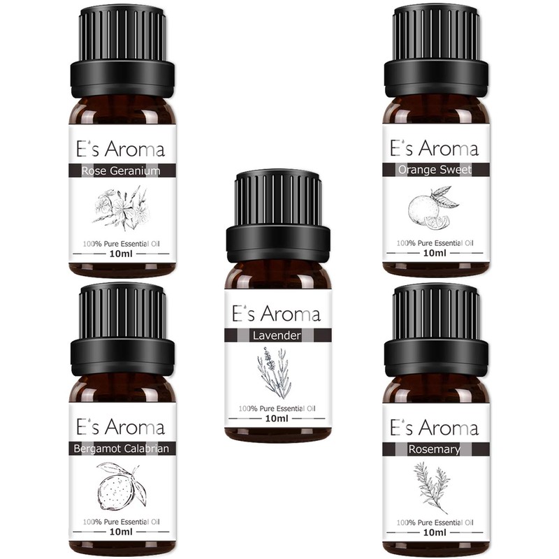 E's Aroma Aroma Aroma Oil Set, 100% Genuine Essential Oils, Carefully Selected Essential Oils, 10ml, Set of 5, Perfect Gift Rosemary, Lavender, Rose Geranium, Orange Sweet, Bergamot, Calabrian