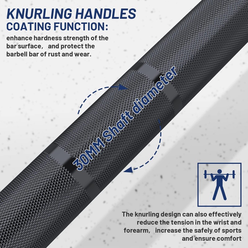 - [Medium Barbell Knurling] The 30mm grip shaft with a 1.2MM diamond knurling, and a moderate whip, increases friction and improves the grip experience. The knurling design can also effectively reduce the tension in the wrist and forearm, increase the safety of sports and ensure comfort