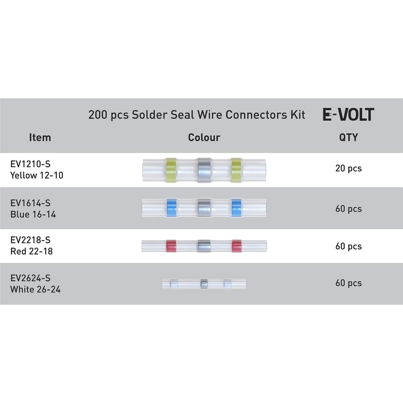 - ALL IN ONE SOLUTION KIT: E-Volt offers a versatile solder connectors kit to make repair work easy and effortless. We have added ample amount of solder seal wire connectors for 4 different wire gauge sizes