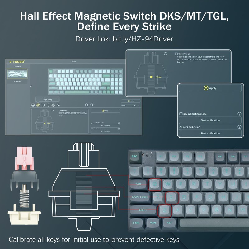 - Adjustable Hall Effect Magnetic Switches ── The entire keyboard is equipped with fully adjustable switches, enabling you to set every key's actuation point from a light 0.1mm to a strong 4mm in 0.1mm steps, putting you in control for fast keypresses or ultra-accurate typing.