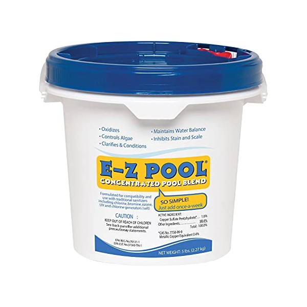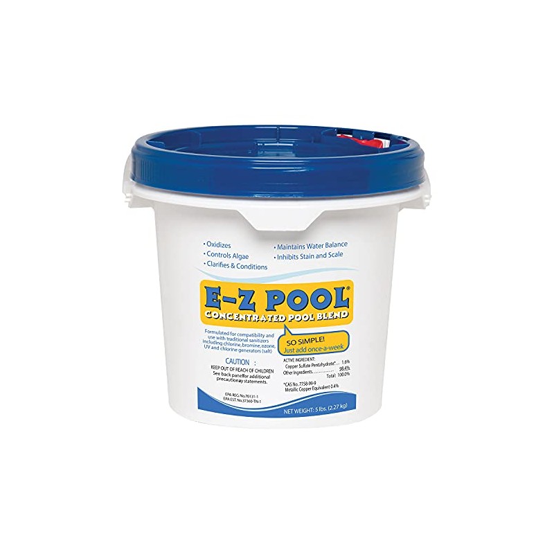 Keep your outdoor pool clean easily with the E-Z Pool All-in-1 Concentrated Pool Care Solution Blend. This water care program features a specially blended, multi-tasking formula that only needs to be applied once a week. E-Z Pool features a stable oxidizer that immediately breaks down contaminants in the water, increasing sanitizer effectiveness. This weekly pool cleaner prevents scale build-up and metallic staining on pool surfaces and equipment. The cleaner also clarifies and conditions the water in your pool, leaving water that won't dry out your skin or leave harsh chemical residue in your hair or on your bathing suit. This pool cleaner contains copper sulfate, which destroys over 20,000 strains of algae. Despite its powerful cleaning capabilities, E-Z Pool leaves your swimming pool with fresh, clean water that is ready to swim in right away. E-Z Pool even enriches the oxygen in your pool water, so you can enjoy sparkling water all pool season long. The E-Z Pool Weekly All in 1 Concentrated Pool Care Solution Blend comes in a 10-pound bucket. Use this cleaning blend once a week and enjoy a pristine swimming pool. Note: This item cannot be shipped to California and will be cancelled/refunded if order is placed.