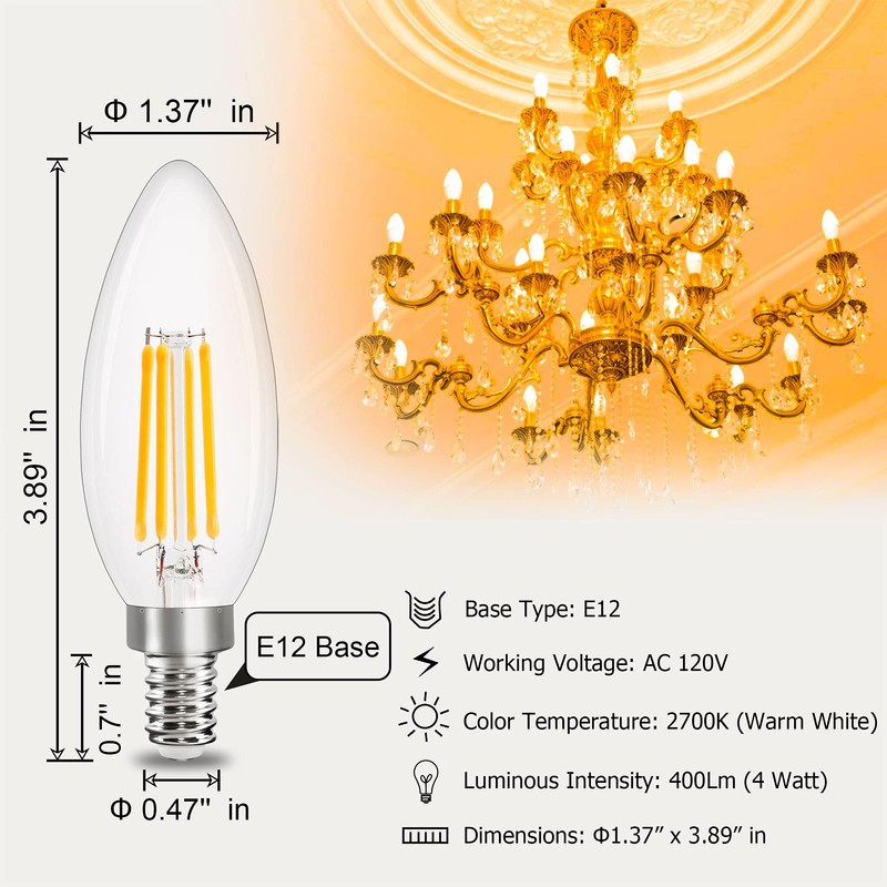 - 【E12 Small Base & Bright Daylight White】 It’s very easy to install with a standard E12 base (12mm diameter). Thus, it can apply for all of the lighting fixtures with E12 base. 2700K color temperature makes your surroundings clearer. The vintage style in candle shape with clear glasses ideally fit for chandeliers,pendant light,ceiling fan, wall sconces.