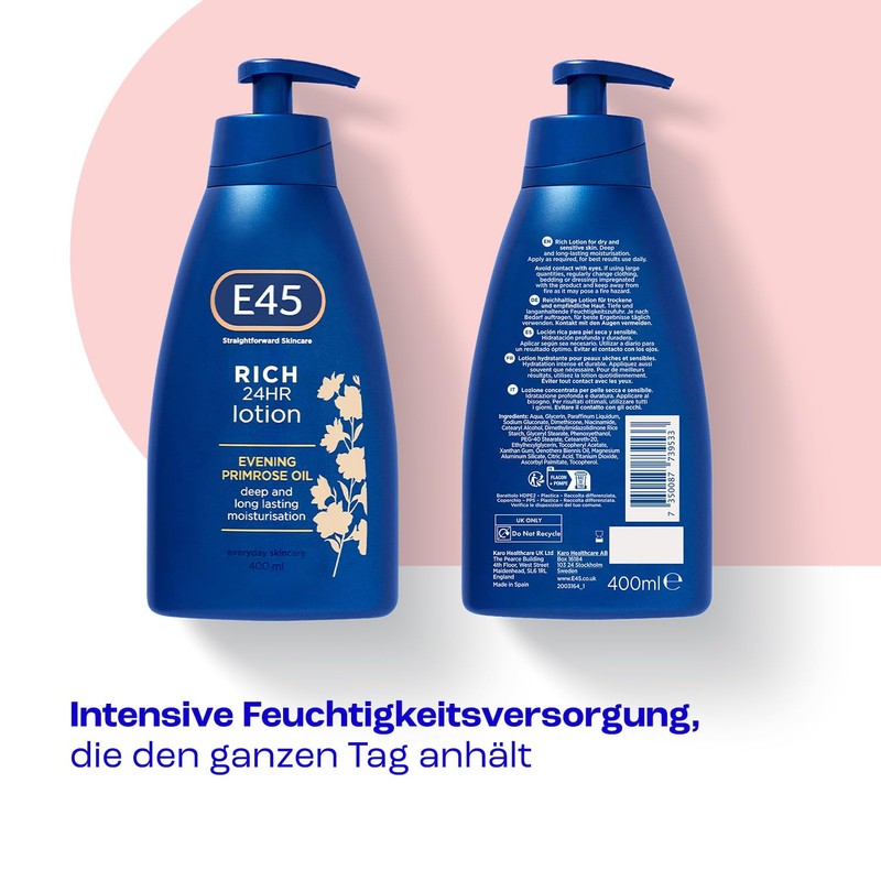 - Deep moisture supply - E45s rich lotion provides deep, long-lasting moisturisation, absorbs quickly and replenishes dry skin. The formula helps lock in moisture for supple skin all day long. An important step in the skincare routine for freshness and hydration."