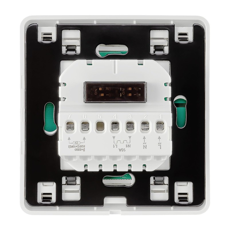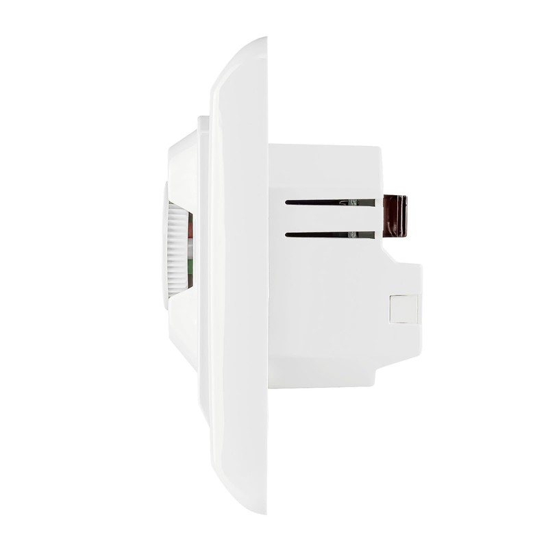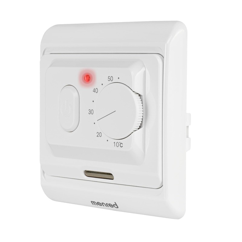 - White thermostat regulator for flush-mounted mounting in standard wall sockets. Room controller can be adjusted the floor and room temperature in a range of 5-55 °C