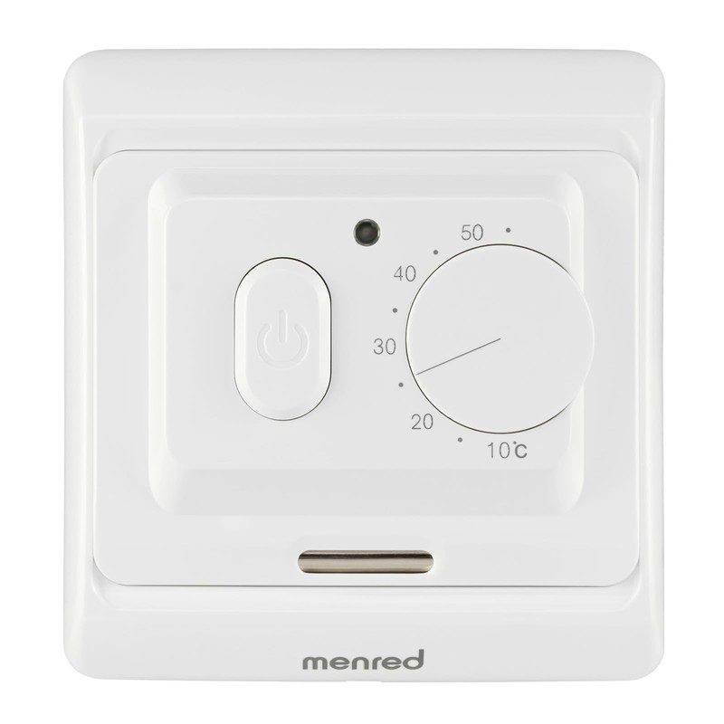 - White thermostat regulator for flush-mounted mounting in standard wall sockets. Room controller can be adjusted the floor and room temperature in a range of 5-55 °C