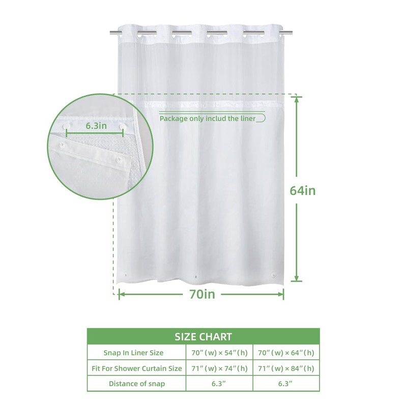 • 70"x64" Size: The 70x54 size is fitted for standard sized 71x74 no hooks needed shower curtains with window, snap in/off for frequent laundering