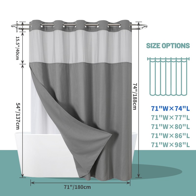 - 【Standard Size】:71"W x 74"L(same size as 71"Wx72"L hooked shower curtain) for shower curtain and 70"W x 54"L for snap-in liner.Fits most standard-sized bathroom