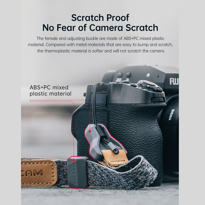 The inner and adjustment buckle are made of ABS + PC mixed plastic. Compared to metal materials that are easy to shock and scratch, the thermoplastic material is softer and does not scratch the camera.
