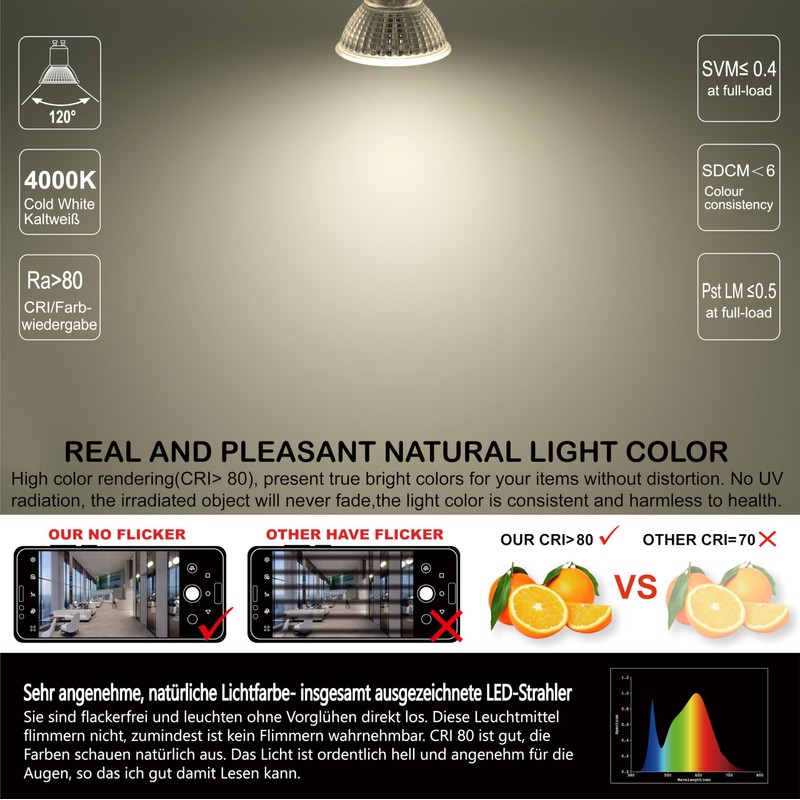- Exzellente Farbwiedergabe und Konsistenz(CRI80, SDCM6), pr?sentieren echte leuchtende Farben fr Ihre Artikel ohne Verzerrung. Keine UV-Strahlung, das bestrahlte Objekt wird nie verblassen, gesundheitlich unbedenklich.