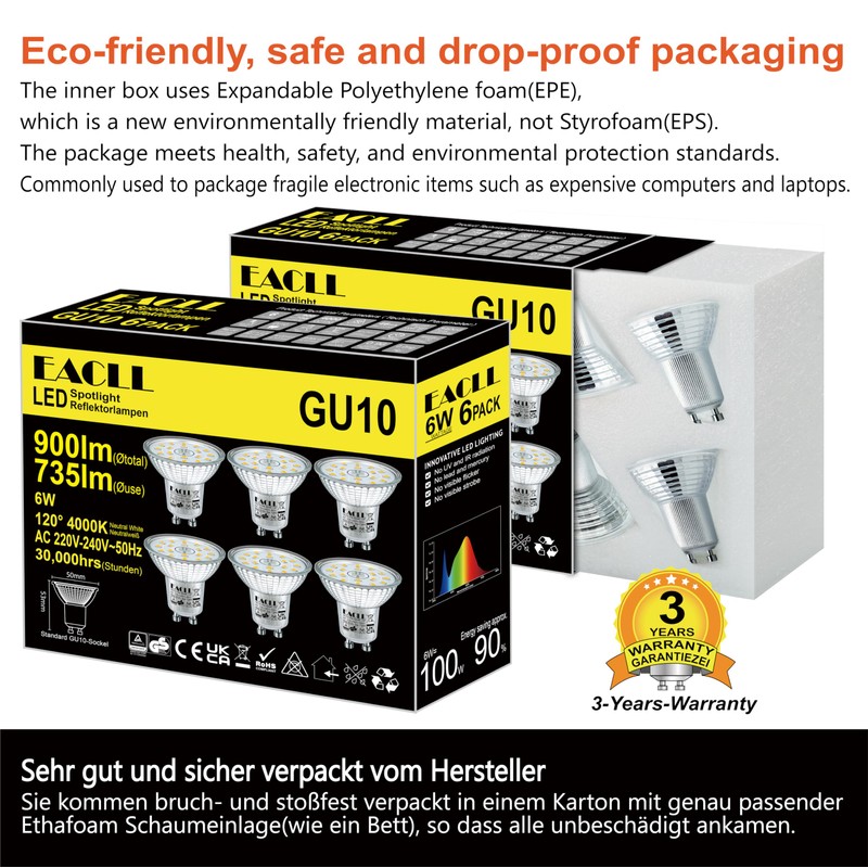 EACLL EACLL GU10 LED 4000K 6W Ersetzt 100W Halogen Leuchtmittel, 6er-Pack. Neutralweiss 735 Lumen Birnen, AC 230V Flimmerfrei Strahler, Abstrahlwinkel 120 Spot, Nicht Dimmbar Reflektorlampen