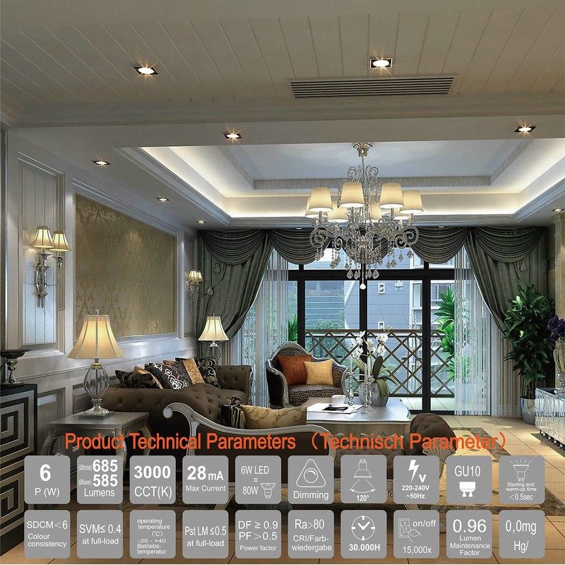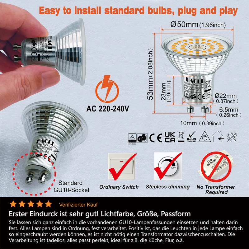 - Einfach zu verbauen Standardlichtquelle, Keine Notwendigkeit fr zus?tzliche Trafo und die Einstellung von Elektrikern. Sie k?nnen die GU10-Sockel einfach einschrauben, Schaffen Sie eine behagliche und natrliche Atmosph?re fr Ihr ganzes Haus. Der Energieverbrauch sinkt mit abnehmender Helligkeit, Sie k?nnen das Energiesparen leicht beherrschen, Geld sparen, praktisch und die Umwelt verbessern.
