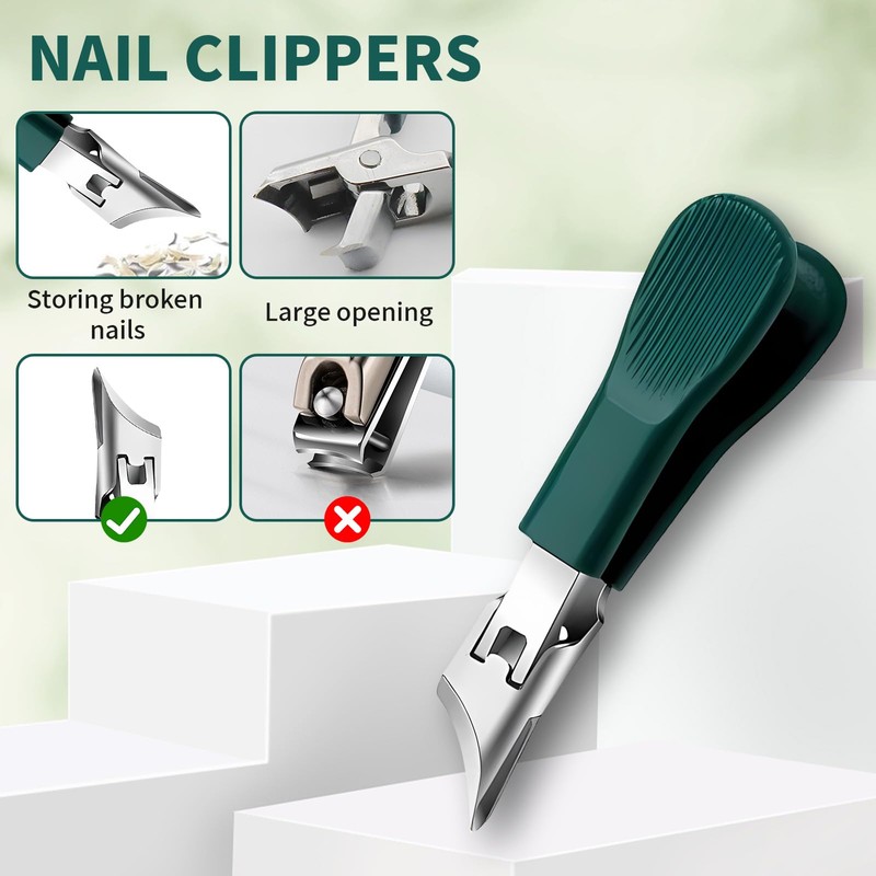 • 【Anti-Splash Containment System​】: Stop messy clippings with these nail clippers' built-in catcher that traps debris mid-cut. Designed as slanted nail clippers with widened jaws, they prevent flying fragments during trimming. The green eagle beak nail clipper model features enhanced splash guards for zero cleanup. Made of easy-wipe stainless steel, it's hygienic for family use. A core component of the organized 3 piece green eagle beak nail clipper set.