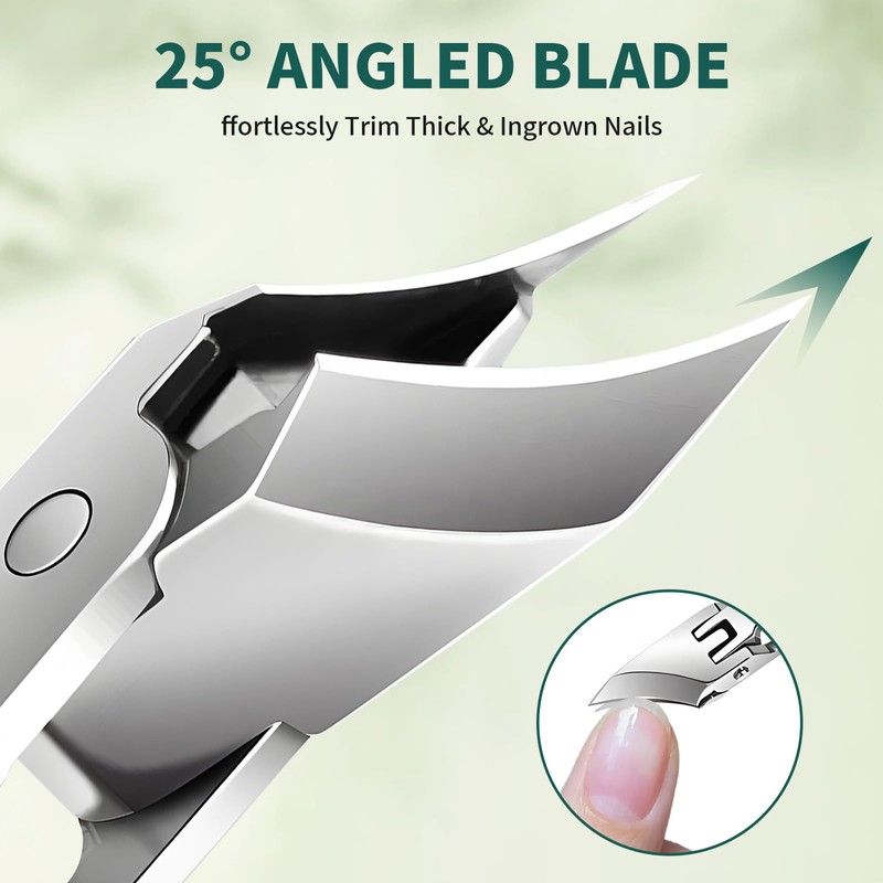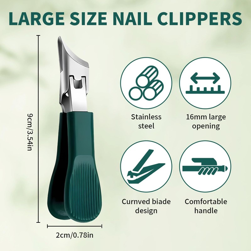 • 【Precision Eagle-Beak Cutting】​: These eagle beak nail clippers feature a curved blade that hugs your nail shape for clean cuts without splitting, especially on thick or ingrown nails. As premium slanted nail clippers, they combine surgical-grade sharpness with a wide jaw opening for effortless trimming. The green eagle beak nail clipper version includes a protective sheath for safe storage. Ideal for home pedicures and ingrown nail care, these clippers deliver professional results every time.