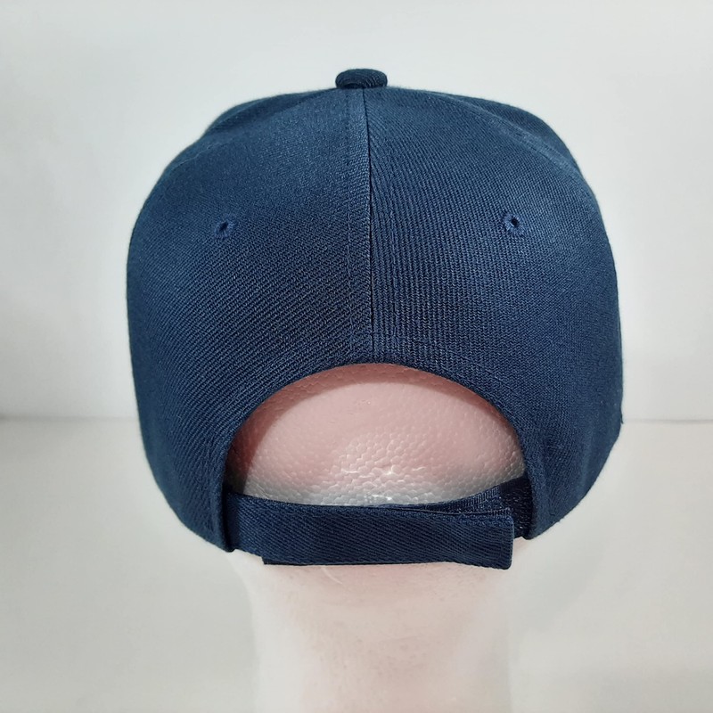 High Quality Embroidered Patch Heat Pressed Onto A 6 Panel Navy Blue Hat