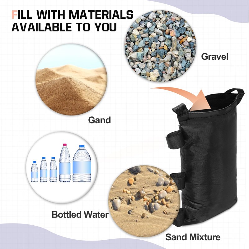 - EASY TO USE: EAGLE PEAK weight bags easily fill with sand, dirt or gravel and offer more stability and added safety. They easily fold and store for convenient transport. Our weight bags are easily attached to canopy legs with 2 velcro straps for a tight fit.