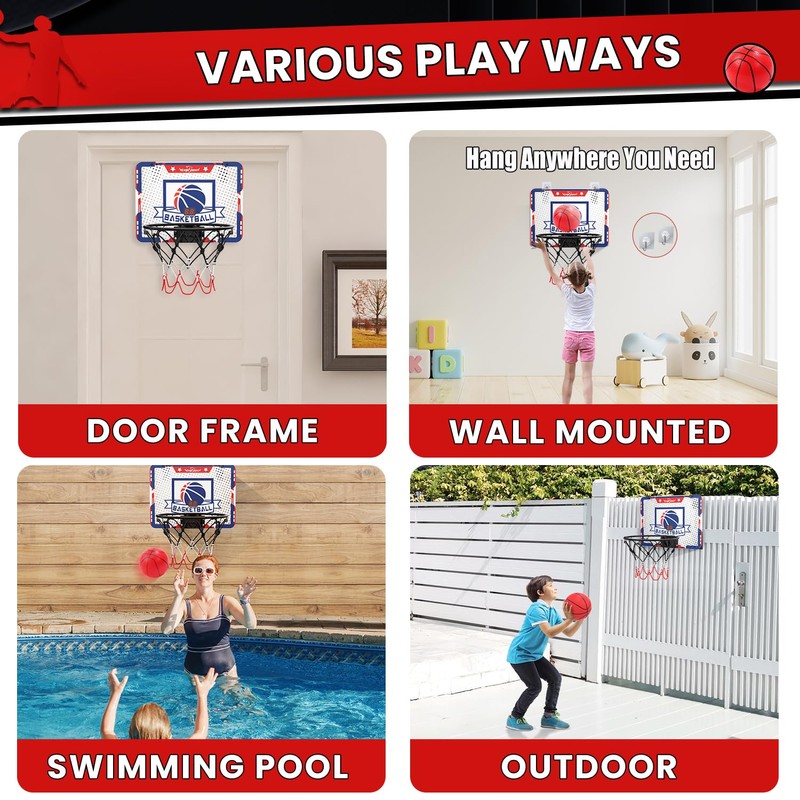 - đăEasy To AssembleăOur mini basketball hoop for Toddlers and babies comes with 4 Basketball Balls and a big hand pump for easy inflation. It has everything you need to play a game of indoor basketball. It fits all common-size doors at home or office. The door and wall basketball hoop are easy to mount with a clear instruction video.