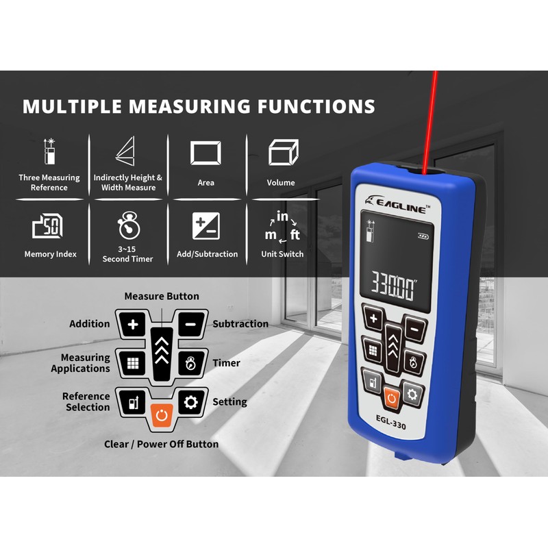 - DESIGNED FOR LARGE-SCALE MEASUREMENTS: Featuring an advanced 3-point height and width measurement, with an upgraded measuring range of 330 feet and a precision of 1/16”. The Eagline EGL330 laser distance measure is suitable for professional contractors, surveyors, or DIY enthusiasts for larger-scale projects.